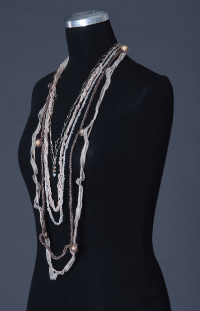 For the pitch of the Japanese gallery 'Kubi no Hana', objects for the neck were created. Soft jewellery and shapes were created by crocheting and sewing.